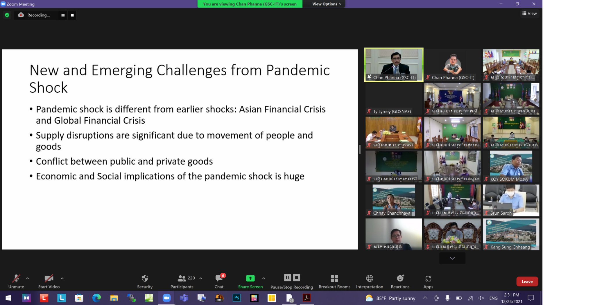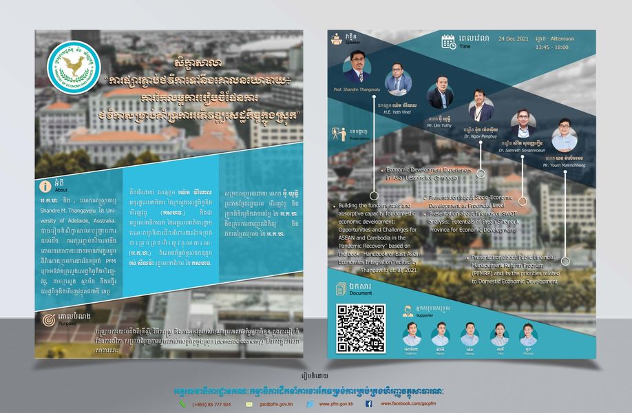 នារសៀលថ្ងៃសុក្រ ៥រោច ខែមិគសិរ ឆ្នាំឆ្លូវ ត្រីស័ក ព.ស.២៥៦៥ ត្រូវនឹងថ្ងៃទី២៤ ខែធ្នូ ឆ្នាំ២០២១, វេលាម៉ោង ២:០០ នាទី, ឯកឧត្តម យ៉េត វីណែល អនុរដ្ឋលេខាធិការ នៃក្រសួងសេដ្ឋកិច្ចនិងហិរញ្ញវត្ថុ (កសហវ.) និងជាអគ្គលេខាធិការរង នៃអគ្គលេខាធិការដ្ឋានគណៈកម្មាធិការដឹកនាំការងារកែទម្រង់ការគ្រប់គ្រងហិរញ្ញវត្ថុសាធារណៈ (អ.គ.ហ.), តំណាង ឯកឧត្តម រស់ សីលវ៉ា រដ្ឋលេខាធិការនៃ កសហវ. និងជាអគ្គលេខាធិការ នៃ អ.គ.ហ., អមដោយ លោក អ៊ុំ យុទ្ធី ប្រធានផ្នែករដ្ឋបាល ហិរញ្ញវត្ថុ និងត្រួតពិនិត្យនិងវាយតម្លៃ, ព្រមទាំងមន្ត្រីជំនាញជាន់ខ្ពស់ និងមន្ត្រីជំនាញ នៃ អ.គ.ហ. បានដឹកនាំសិក្ខាសាលាតាមរយៈប្រព័ន្ធវីដេអូអនឡាញ ស្តីពី “ការផ្សារភ្ជាប់ថវិកាទៅនឹងគោលនយោបាយ- ការកែលម្អការរៀបចំផែនការថវិកាសម្រាប់គាំទ្រការអភិវឌ្ឍសេដ្ឋកិច្ចក្នុងស្រុក” ដោយមានការចូលរួមជាវាគ្មិនពីលោកសាស្ត្រាចារ្យ Shandre M. Thangavelu មកពីសាកលវិទ្យាល័យ Adelaide ប្រទេសអូស្ត្រាលី, ទីប្រឹក្សា អ.គ.ហ., មន្ត្រីជំនាញជាន់ខ្ពស់ នៃ អ.គ.ហ., និងតំណាងមន្ទីរ សហវ. ខេត្តព្រះសីហនុ ព្រមទាំងមានការចូលរួមជាសិក្ខាកាមពីអង្គភាពក្រោមឱវាទ កសហវ. រួមទាំងមន្ទីរ សហវ. រាជធានី ខេត្ត និងក្រសួង ស្ថាប័ន ។ សិក្ខាសាលានេះ ត្រូវបានរៀបចំឡើង ក្នុងគោលបំណងបញ្ជ្រាបការយល់ដឹងអំពីទ្រឹស្តី, វិធីសាស្រ្ត និងការអនុវត្តរបស់បណ្តាប្រទេសជាគំរូមួយចំនួន ក្នុងការរៀបចំផែនការថវិកា សម្រាប់ជំរុញការលូតលាស់សេដ្ឋកិច្ចក្នុងស្រុក និងការធ្វើឱ្យប្រសើរឡើងនូវការផ្តល់សេវាសាធារណៈ ។